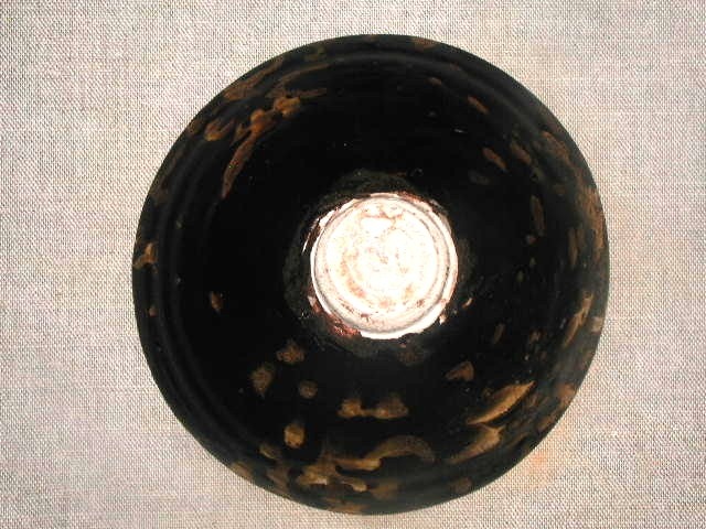 conical tea bowl with tortoiseshell glaze. Exterior and interior dark